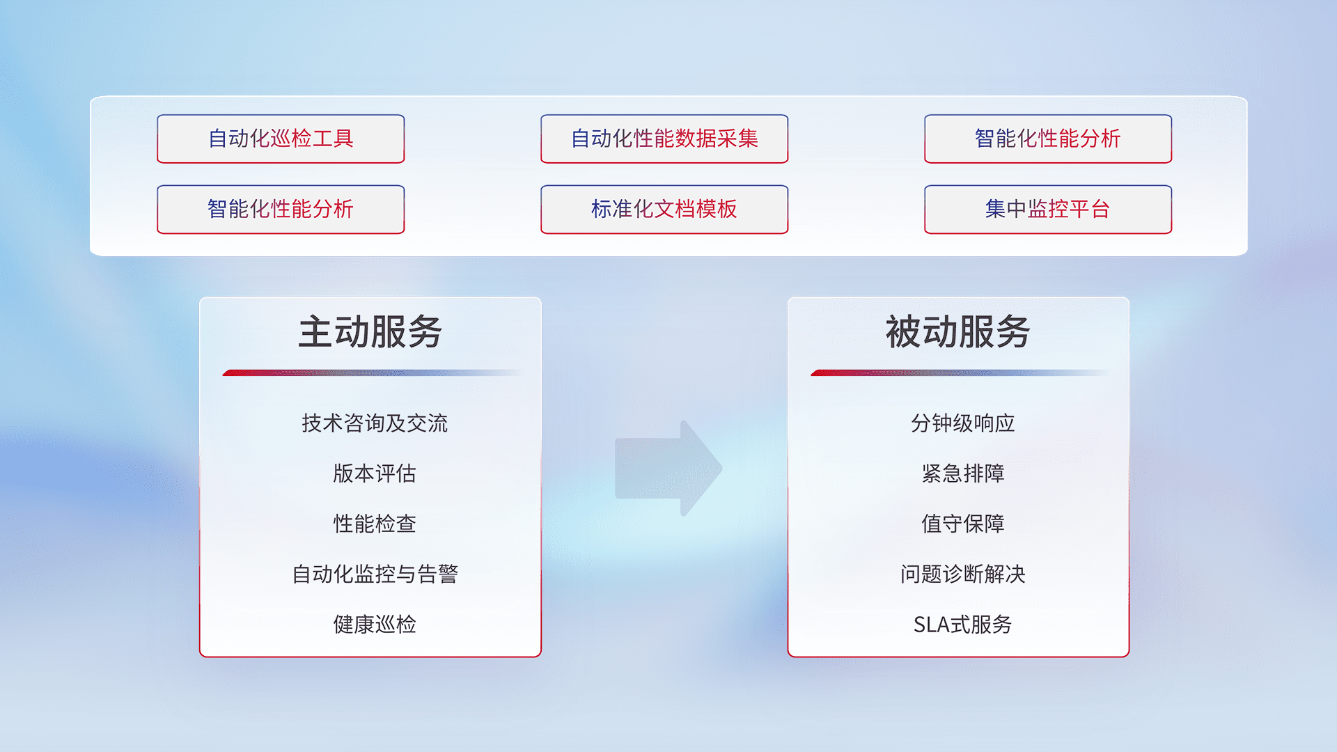 智能化工具和标准化文档,,保障服务质量,,,提供主动服务(包含技术咨询、、版本评估、、、性能检查、、自动化监控与告警、、健康巡检)和被动服务包含(分钟级响应、、、紧急排障、、值守保障、、、、问题诊断解决、、、SLA服务)。。。