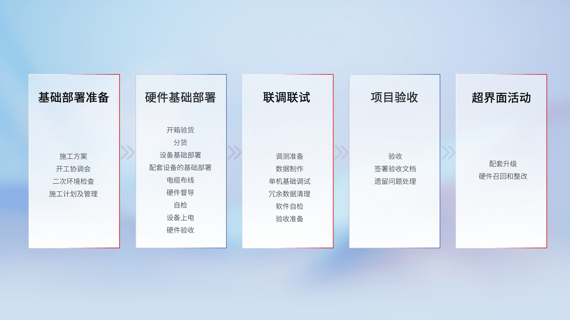 从基础部署准备、、硬件基础部署、、联调联试、、、、项目验收、、、、越界面活动的全过程可追溯,,保证施工质量和进度。。